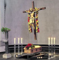 In der Pfarrkirche St. Maria Magdalena zu Höntrop (Bistum Essen) hat die Kirchgemeinde ein Taufbecken in den Boden der Kirche eingelassen und stellt bei einem Requiem den Sarg auf diese Taufstelle, um die Verbindung von Tod und Leben zu dokumentieren. Ich finde diese Praxis genial. Da braucht es nicht viele Worte der Erklärung, wenn bekannt ist, was Taufe bedeutet. Taufe ist ja mehr als bloße Namensgebung von Schiffen. Taufe ist frohe Botschaft, die das Leben leichter macht. Danken wir Gott, dass wir getauft wurden und mit Christus durch den Tod zum Leben gehen können.